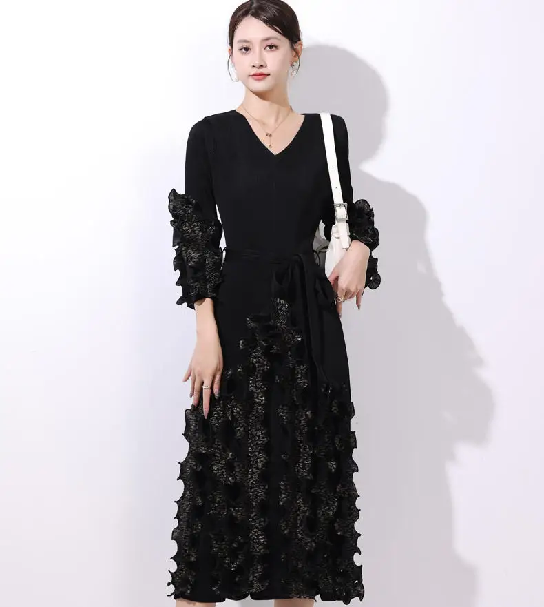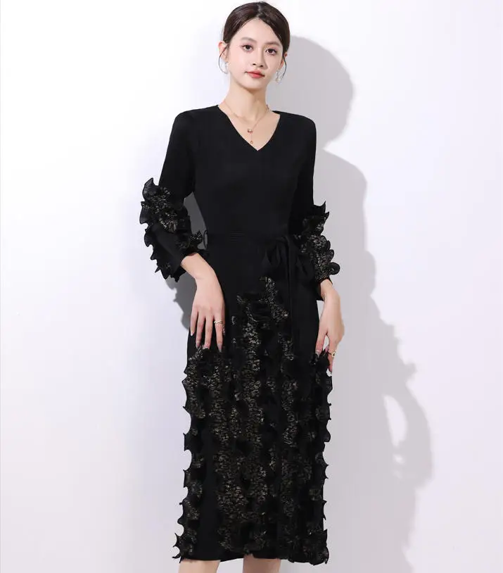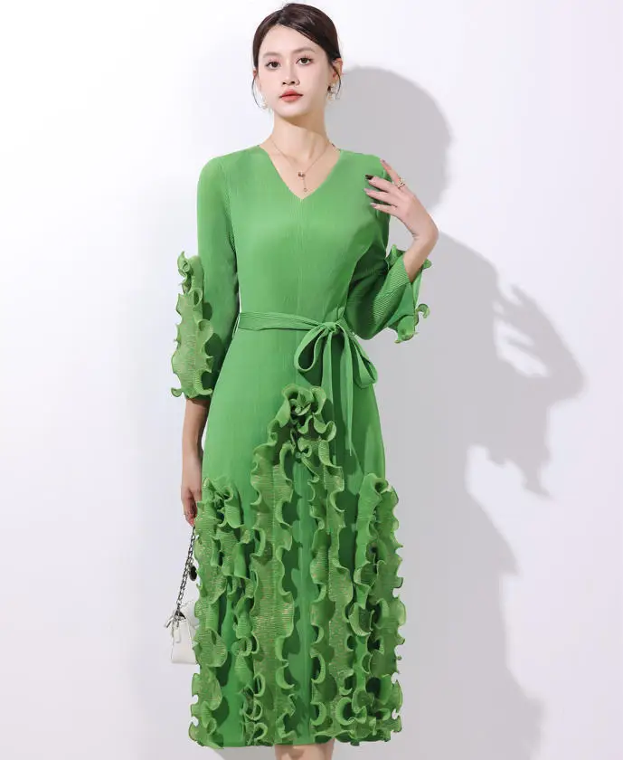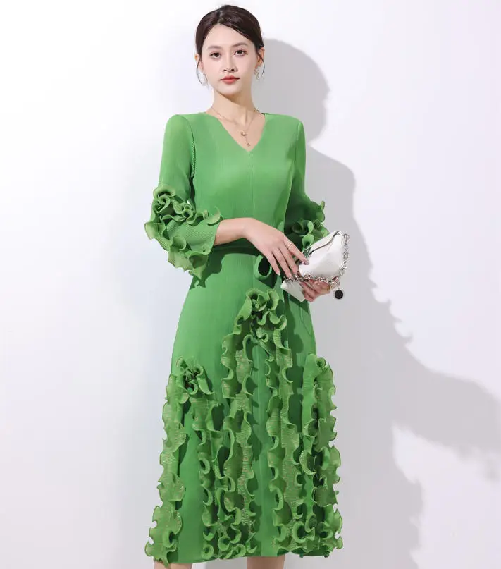 European and American Popular Pleated Dress with V-neck and Ruffled Hem - Large Size Ready-to-wear Dress